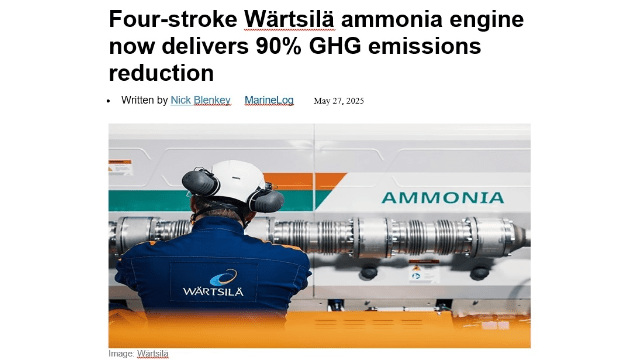 Wärtsilä rapporte que son moteur à quatre temps alimenté à l’ammoniac offre désormais des niveaux d’efficacité et de performance plus élevés que jamais. Après son introduction dans le secteur maritime commercial en novembre 2023, le moteur à ammoniac Wärtsilä 25 a fait l’objet de tests approfondis afin d’optimiser ses paramètres de performance. Selon Wärtsilä, les derniers résultats, évalués par rapport à la référence maritime FuelEU et mesurés à la fois sur la base "Well-to-Wake" and "Tank-to-Wake" (Ndlr : L’approche “well-to-wake” prend en compte toutes les émissions de gaz à effet de serre (GES), depuis la phase d’extraction ou de production du carburant jusqu’à son utilisation finale à bord des navires. le WtW englobe l’ensemble du cycle de vie du carburant. L’approche "tank-to-wake" signifie du réservoir au sillage, à l’utilisation finale), montrent qu’une part d’énergie de 95 % d’ammoniac permet désormais une réduction de 90 % des émissions de gaz à effet de serre par rapport aux moteurs au fioul équivalents. Il s’agit d’une amélioration de 18 % des performances du moteur à ammoniac en matière d’émissions.