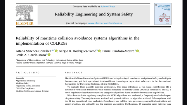 Highlights•Proposed a verification framework to formally assess algorithm compliance.•Introduced a classification matrix for MCPS based on COLREGs compliance levels.•Evaluated 855 MCPS papers; only 464 attempted to implement COLREGs rules.•No algorithm achieved full compliance with key COLREGs operational rules.•Identified 29 recurring implementation errors compromising navigational safety.À lire sur : https://doi.org/10.1016/j.ress.2025.111840Auteurs de l'étude : Aitana Sanchez-Gonzalez , Sergio R. Rodrigues-Tome, Daniel Cardoso-Mestre , Jesús A. García-Maza